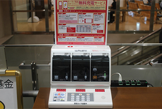無料でご利用いただけるセルフ式ケータイ電話充電器を設置いたしました。また、お客様の声を多く寄せられた1階到着ロビーにも同様のものを設置いたしました。是非、ご利用ください。